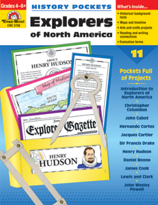 History Pockets-Explorers of North America, Grades 4–6+, contains eleven discovery pockets. The introduction pocket gives an overview of exploration throughout North America. The other pockets feature ten famous explorers and their journeys.