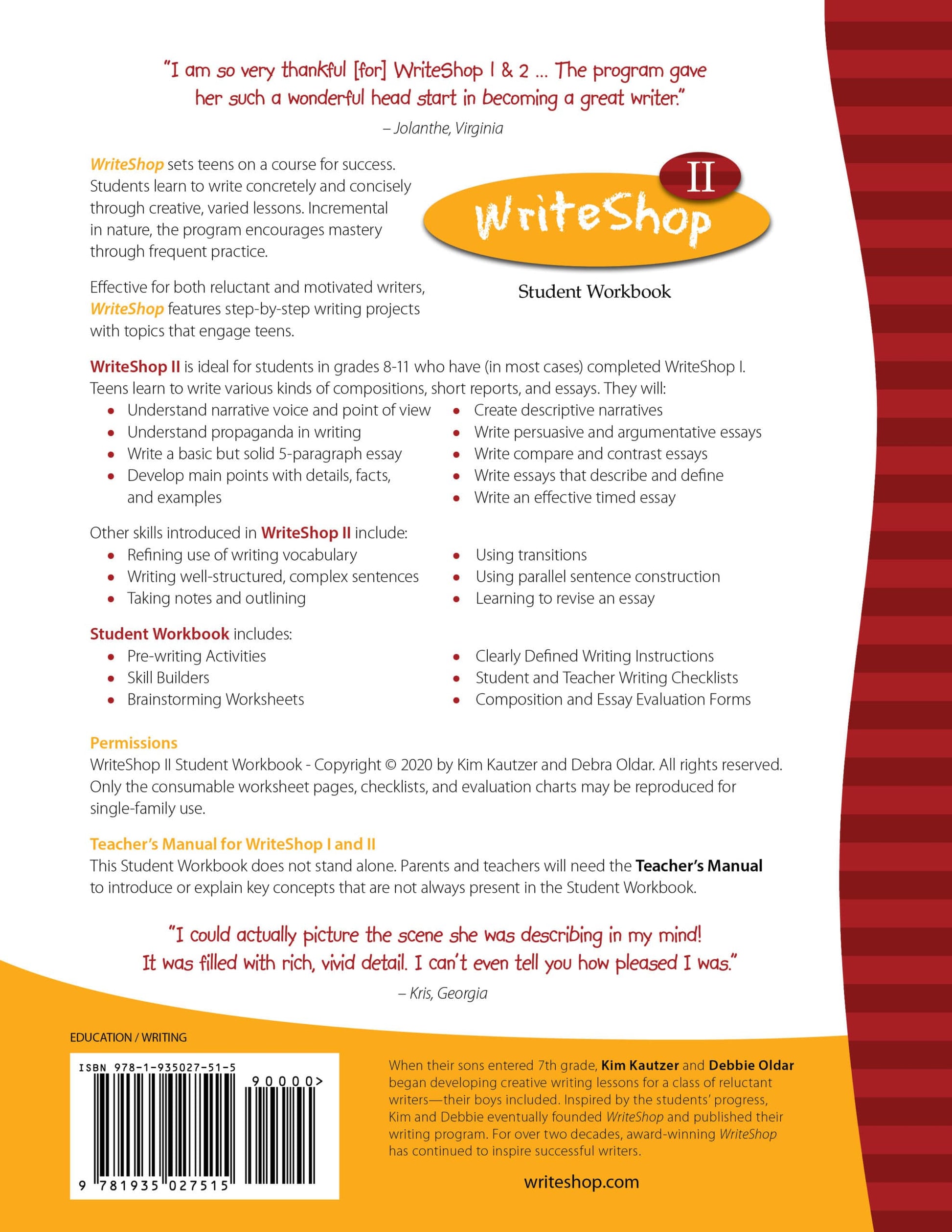Where WriteShop I established a basic framework of descriptive, informative, and narrative writing, WriteShop II helps students expand their writing abilities. This second volume builds on that earlier foundation as compositions shift focus to descriptive narration, narrative voice, point of view, and use of tense. Later lessons introduce persuasive writing and the basic 5-paragraph essay model. Students will write multiple kinds of essays, where they will learn to express an opinion and develop and support it with facts, details, and examples.