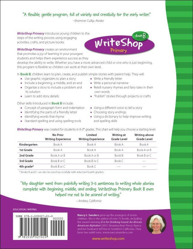 WriteShop Primary Book B introduces the steps of the writing process through engaging activities, crafts, and picture books and creates an environment that promotes a joy of learning. The program accommodates pre-writers as well as beginning and developing writers. Children who are reluctant or not able to write on their own are encouraged to dictate their stories and ideas to you.