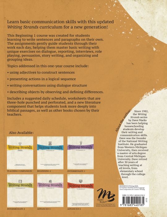 Writing Strands Beginning 1 takes a comprehensive approach to language arts, teaching students components of grammar, sentence construction, logical sequencing, and structure while also developing the student's reading, writing, and speaking skills. Students learn how to read and evaluate literature, practice spelling, address envelopes, learn the importance of eye contact, and so much more!