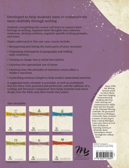Writing Strands Intermediate 1 takes a comprehensive approach to language arts, teaching students how to construct effective paragraphs, add structure to stories, and explore narrative voice while also developing the student's reading, writing, and speaking skills. Students will learn how to read and evaluate literature, practice spelling, analyze worldview, and write a story!